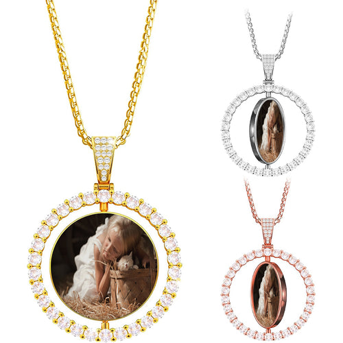 Personalized Heart Photo Necklace: Iced Out Crystal Spinner Charm -
